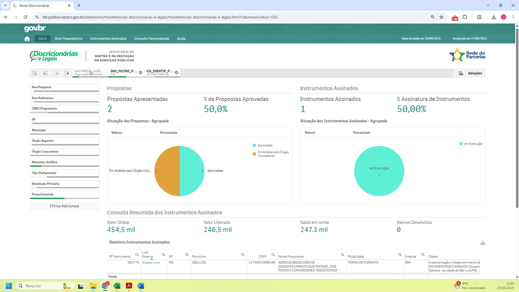 PROCESSO ADMINISTRATIVO: 71000.041961/2024-06; PROPOSTA DE TERMO DE FOMENTO; - MESP; ADMINISTRAÇÃO PÚBLICA FEDERAL: Ministério do Esporte, CNPJ nº 02.961.362/0001-74; ORGANIZAÇÃO DA SOCIEDADE CIVIL (OSC): Agência Brasileira de Desenvolvimento Sustentável dos Povos e Comunidades Tradicionais (Oficina de Sonhos), CNPJ nº 32.756.933/0001-08; FUNDAMENTO LEGAL: Lei Federal nº 13.019/2014, Decreto Federal nº 8.726/2016; OBJETO: Implementação e Desenvolvimento do Projeto Prateados em Movimento: Vida Ativa na Terceira Idade, no Município de Balsa/MA; PRAZO DE EXECUÇÃO: A definir após assinatura; VIGÊNCIA: A definir após assinatura; VALOR: R$ 355.400,00 (trezentos e cinquenta e cinco mil e quatrocentos reais); DOTAÇÃO ORÇAMENTÁRIA: Fonte: Número do Empenho2024NE000989, Emenda Parlamentar nº 50120003 (Deputado Márcio Honaiser); Programa de Trabalho: 2030402012.102; Elemento de despesa: 33.50.43 (Subvenções Sociais).