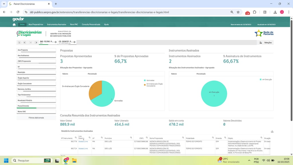 PROCESSO ADMINISTRATIVO: 71000.041960/2024-53; TERMO DE FOMENTO REGISTRADO SOB O Nº 962779/2024-MESP; ADMINISTRAÇÃO PÚBLICA FEDERAL: Ministério do Esporte, CNPJ nº 02.961.362/0001-74; ORGANIZAÇÃO DA SOCIEDADE CIVIL (OSC): Agência Brasileira de Desenvolvimento Sustentável dos Povos e Comunidades Tradicionais (Oficina de Sonhos), CNPJ nº 32.756.933/0001-08; FUNDAMENTO LEGAL: Lei Federal nº 13.019/2014, Decreto Federal nº 8.726/2016; OBJETO: Implementação do Projeto "Movimentando Sonhos" com escola de futebol para crianças e adolescentes em vulnerabilidade social; PRAZO DE EXECUÇÃO: 31 de dezembro de 2025; VIGÊNCIA: 16 meses; VALOR: R$ 454.499,98 (quatrocentos e cinquenta e quatro mil, quatrocentos e noventa e nove reais e noventa e oito centavos); DOTAÇÃO ORÇAMENTÁRIA: Fonte: a 20JP, PTRES 248279, Elemento de Despesa: 33.50.41 Unidade Gestora: 180073/00001 - Nota de Empenho nº 2024NE001030, Fonte 1000000000, Emenda Parlamentar nº 50060002 (Deputado Márcio Honaiser); Programa de Trabalho: 2030402012.101; Elemento de despesa: 33.50.43 (Subvenções Sociais).