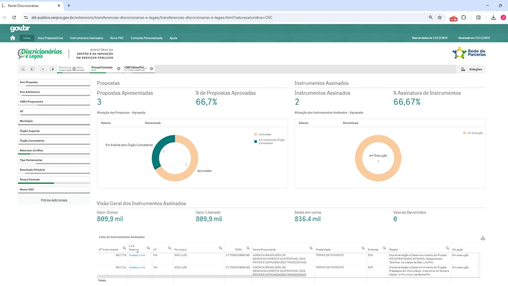 PROCESSO ADMINISTRATIVO: 71000.090791/2025-66; TERMO DE FOMENTO REGISTRADO SOB O Nº 980725; ADMINISTRAÇÃO PÚBLICA FEDERAL: Ministério do Esporte, CNPJ nº 02.961.362/0001-74; ORGANIZAÇÃO DA SOCIEDADE CIVIL (OSC): Agência Brasileira de Desenvolvimento Sustentável dos Povos e Comunidades Tradicionais (Instituto Oficina de Sonhos), CNPJ nº 32.756.933/0001-08; FUNDAMENTO LEGAL: Lei Federal nº 13.019/2014, Decreto Federal nº 8.726/2016; OBJETO: Implementação e desenvolvimento do projeto Construindo Sonhos pelo Esporte:Futebol e Inclusão em Balsas/MA; VIGÊNCIA: 09/12/2025 a 09/03/2027; VALOR: R$ 809.941,00 (oitocentos e nove mil novecentos e quarenta e um reais).